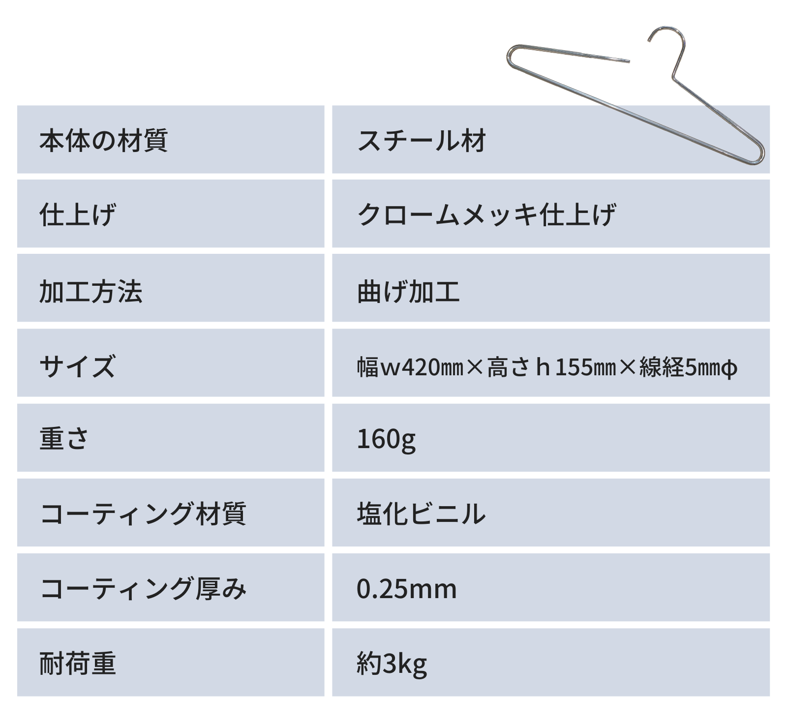 スチール製で丈夫な反面滑りやすい弱点がありますが、塩化ビニールでコーティングすることで、滑りにくく衣類も保護できます。