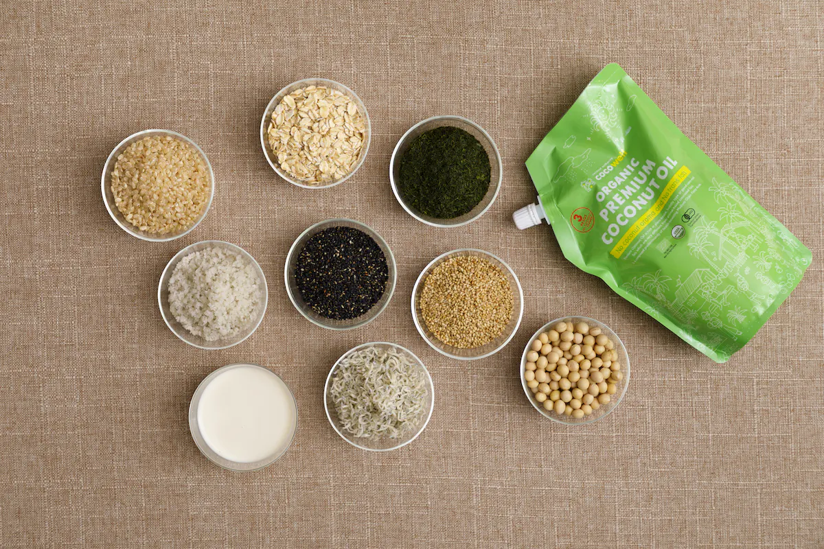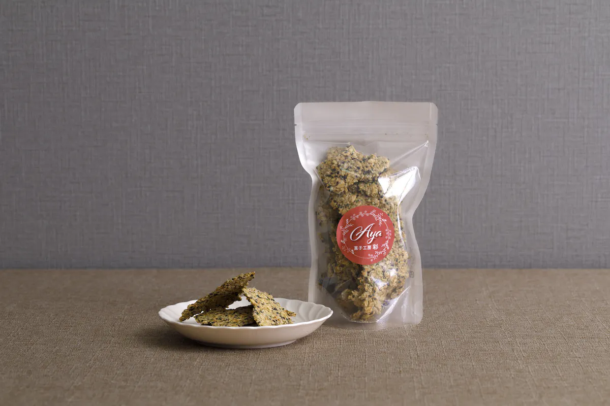 有機 オートミール・有機 ココナッツオイル・有機焙煎玄米粉・おからパウダーを主に、名前そのままにごま・青のり・ちりめんじゃこを焼き込みました。