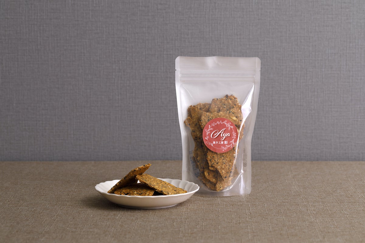 有機オートミール・有機ココナッツオイル・有機焙煎玄米粉・おからパウダーを主に、パルメザンチーズ・チェダーチーズをふんだんに入れて焼き上げています。朝食にもおやつにも、お酒のお供にも召し上がっていただけます。賞味期限3か月。直射日光が当たらない冷暗所で保管ください。開封後はなるべく早くお召し上がりください。
