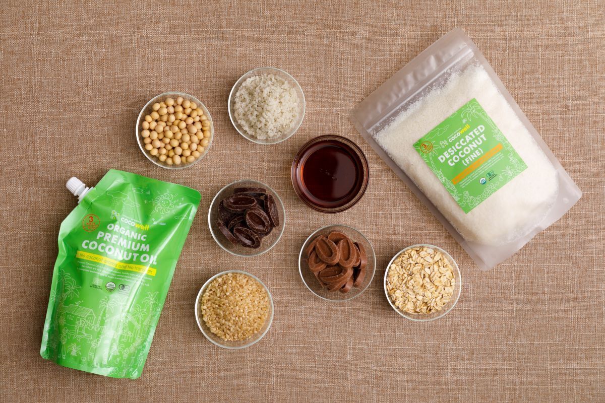 有機オートミール・有機ココナッツオイル・有機焙煎玄米粉・おからパウダーを主に有機ココナッツファイン・有機ココナッツシュガー・クーベルチュールノアとミルクで焼き上げました。ココナッツの香りとチョコレートのマリアージュ。美味しい組み合わせです。賞味期限3か月。直射日光が当たらない冷暗所で保管ください。開封後はなるべく早くお召し上がりください。