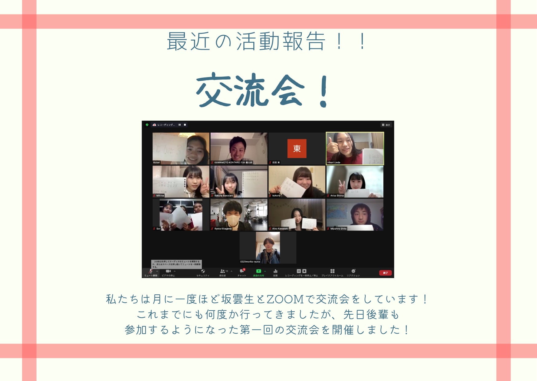 先日のテーマはラオス語と日本語で名前を書けるようになること!あまり馴染みのない文字なため、みんな書くのにすこし苦戦しましたが、名前発表を楽しく行いました。坂雲生の日本語の名前はとても上手でした!第二回の開催を楽しみにしています!