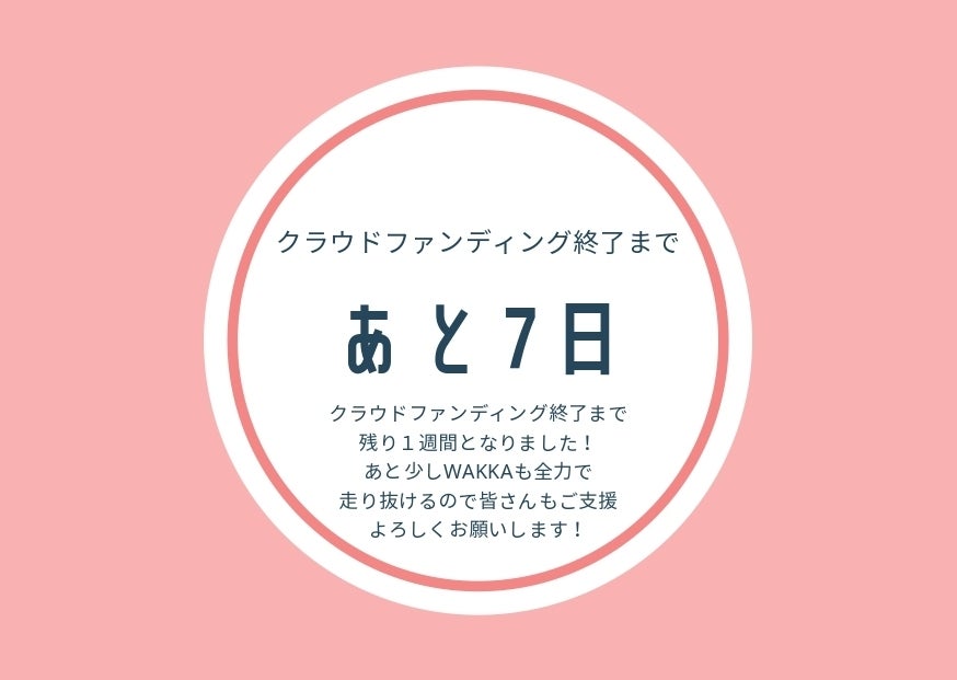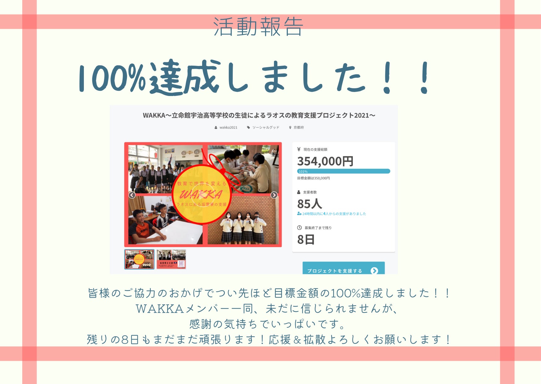 皆様のご支援のおかげで、目標額100%達成しました!!WAKKAメンバーは100%の達成をほぼ全員同時に知り、感激と喜びで溢れています!皆さまからのご期待に応えられるようにもう一度気を引き締め、残り8日、全力でプロジェクトに取り組みます。応援よろしくお願いします!