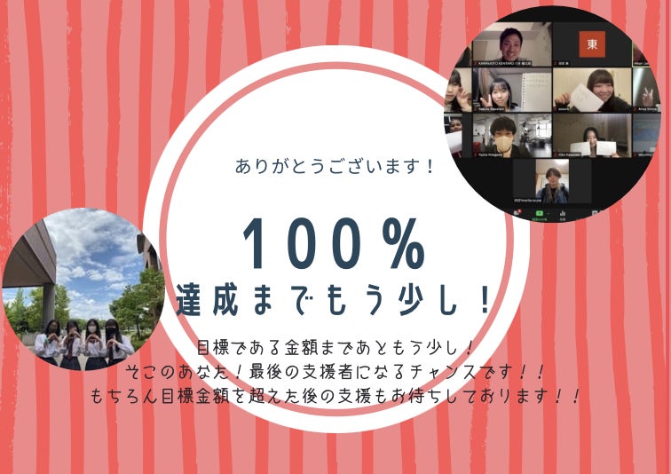 皆さんのご厚意でここまで支援金を集めることができました!ありがとうございます。100%にすることはもちろんそれ以上の支援金を集めるためにこれからも頑張っていきますのでよろしくお願いします!