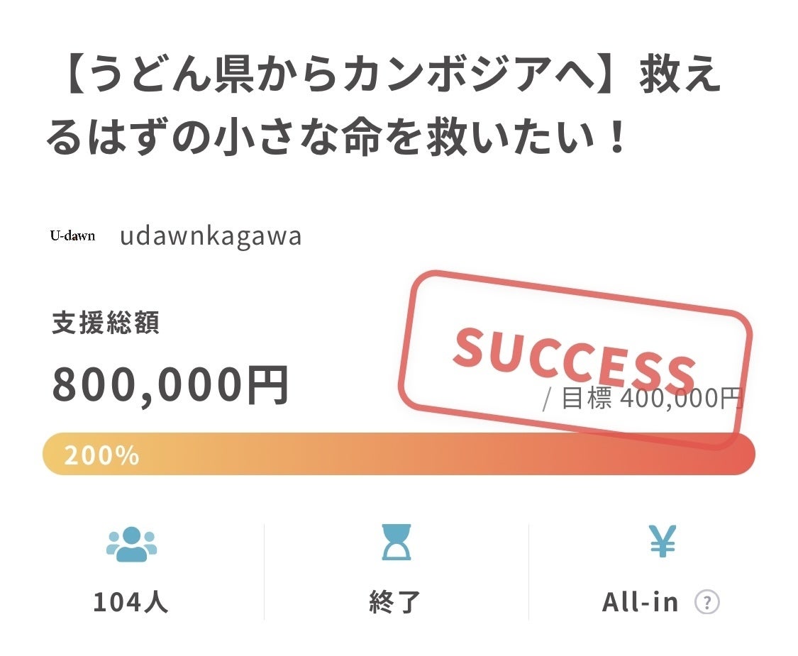 昨日1/31で、「【うどん県からカンボジアへ】救えるはずの小さな命を救いたい」のクラウドファンディングが終了いたしました。
