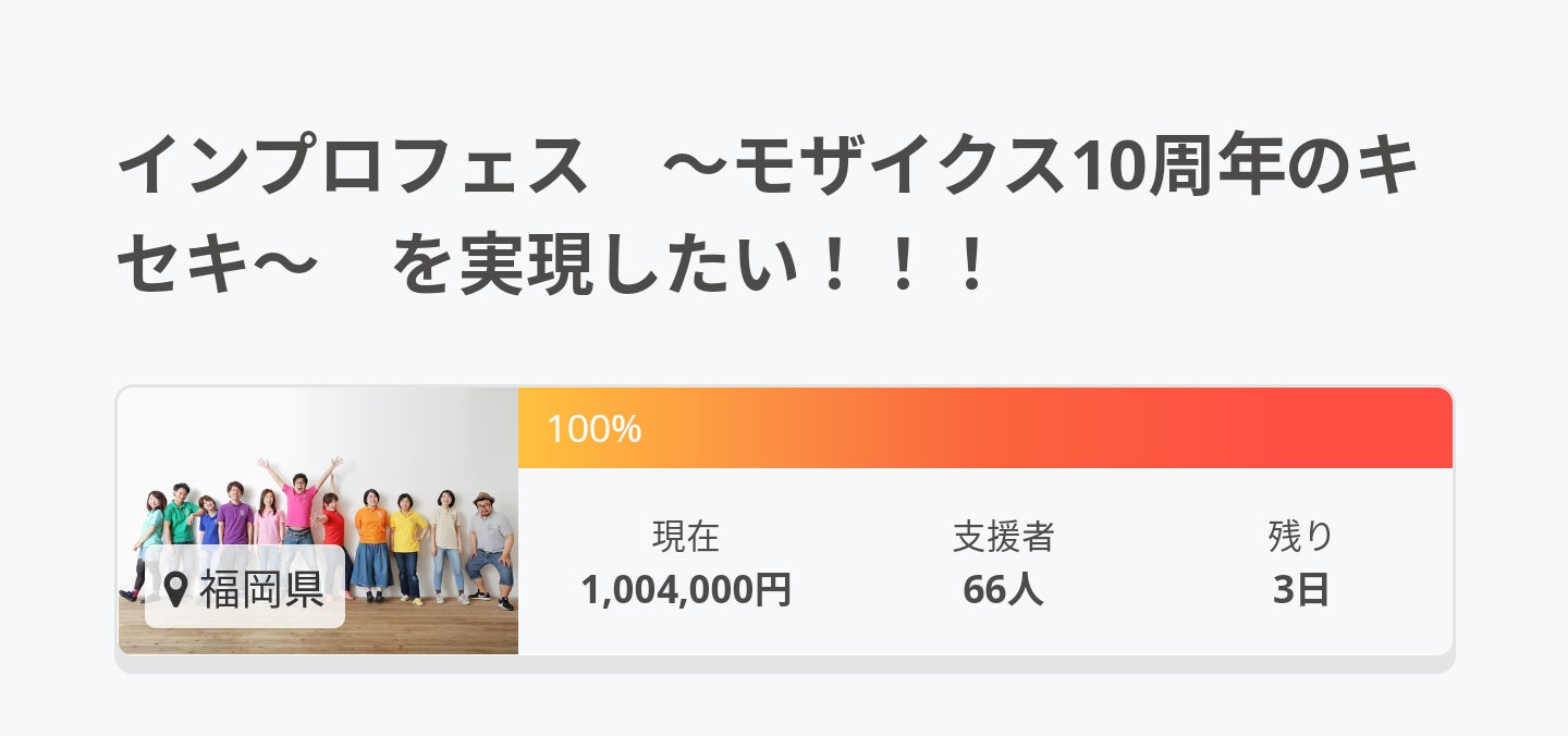 2021/12/28 16:49100万円達成しました。もう(涙)です。ありがとうございます。みなさんの応援支援期待を頂いて100万円達成しました。安心して10周年記ライブ開催です。遠方から参加のゲストの宿泊費、抗原検査、消毒薬などに当てさせていただきます。ありがとうございます。画像キャプションただ…ライブ当日会場に観にきてくれるかたオンラインで視聴してくれるかたが…少ないのです。こちらにも引き続き応援お願いします。クラウドファンディングは31日までです。 もっと見る