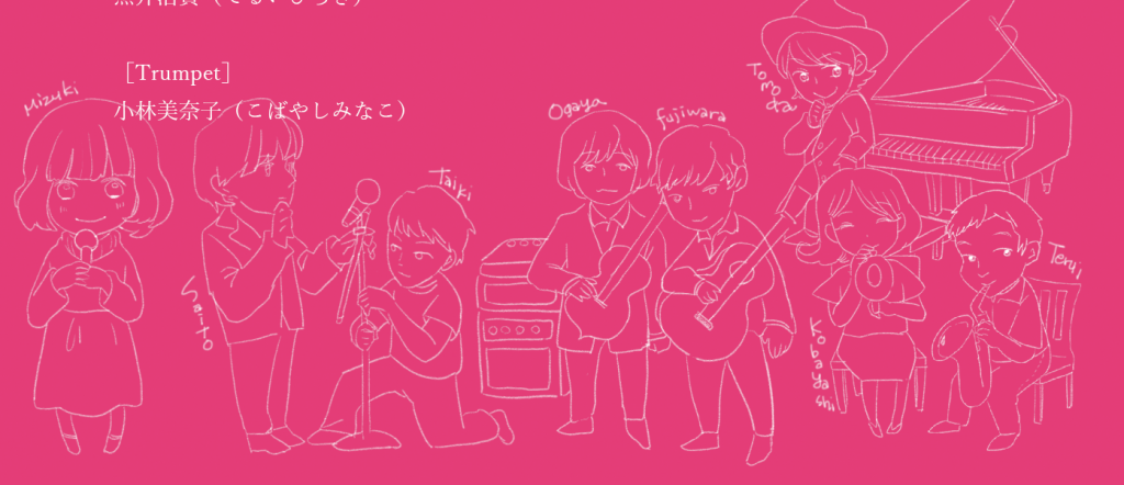 イラストのイメージとして現在発売中のアルバムのクレジットにある制作メンバーの似顔絵をこちらに載せます。