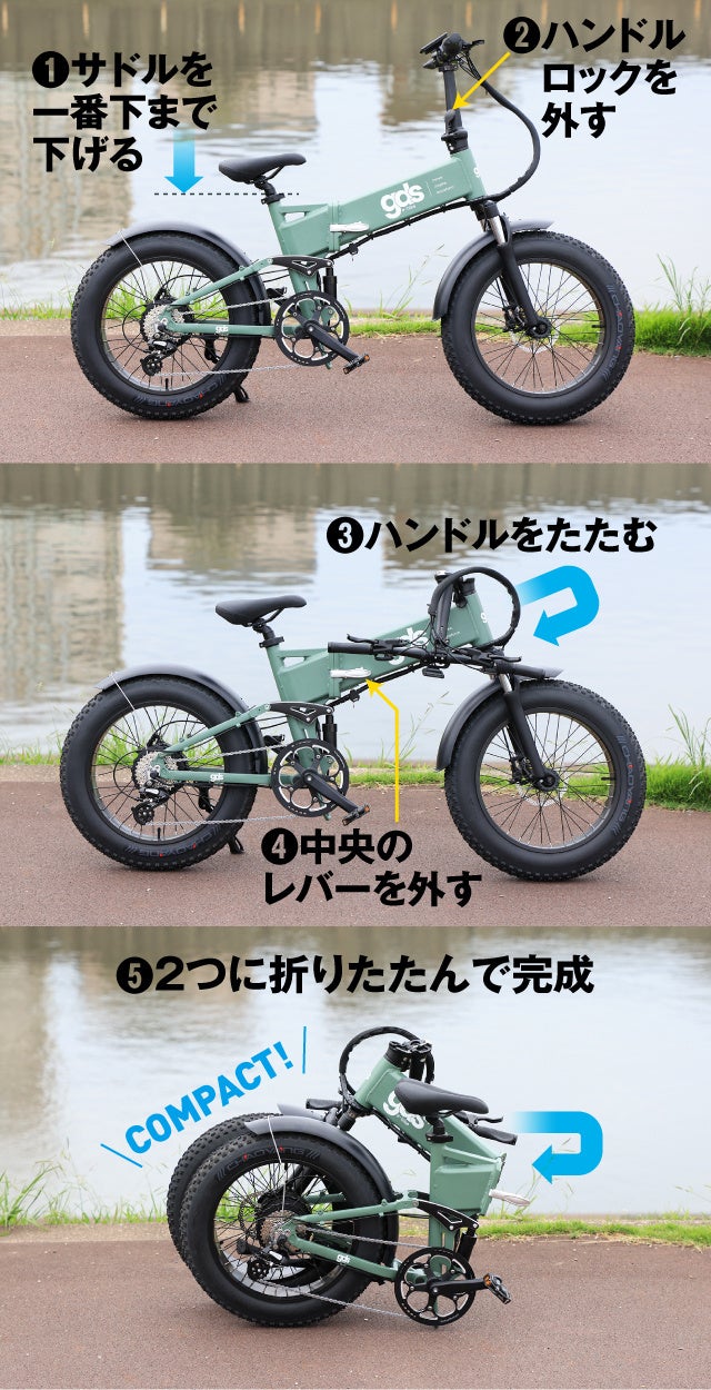 ハンドルをたたみ、トップチューブを固定する中央のレバーを外して2つに折りたためば完成です。
