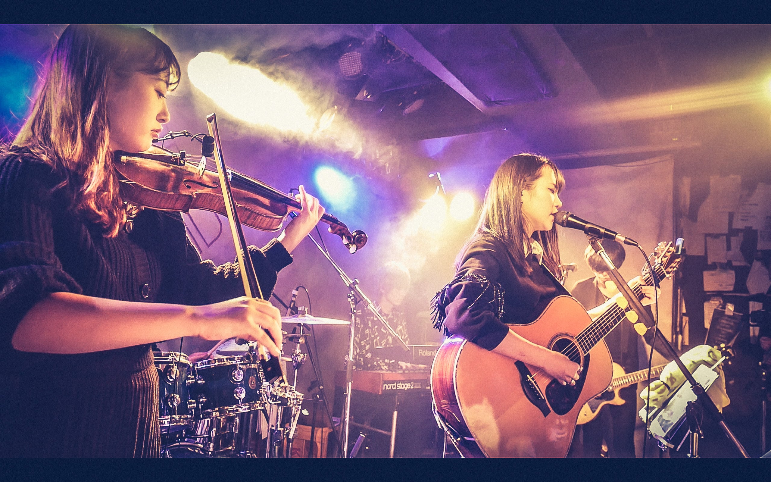 アコースティックとエレクトリック、2つのヴァイオリンを使い分ける奏者。