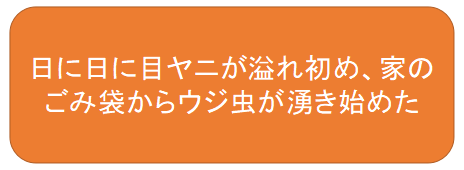 旦那様の目からは目ヤニが溢れていて、それを取り除こうとはしませんでした。入口付近のごみ袋にはウジ虫が湧いていました。