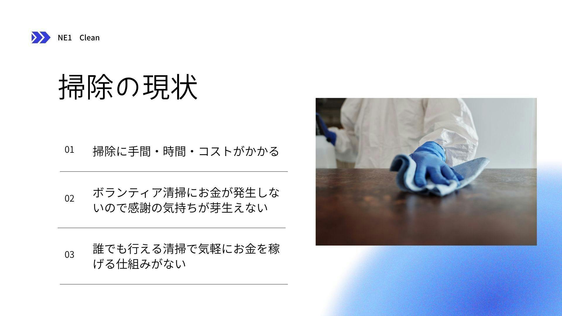 自分が掃除したいけれどなかなか時間がない、誰かに依頼したいけれど料金が高かったりハードルが高かったりする場合がある。汚いと思ったところを見つけると誰でも簡単に掃除の手配ができ、近くにいる人が掃除の依頼を受ける。そうして依頼を受けた人は空き時間などで掃除することができ、副収入を得ることができる仕組みを作っていきたい。掃除というなかなかやりたくない仕事をもっと身近に、もっと気軽にできるようにしたいと思っています。