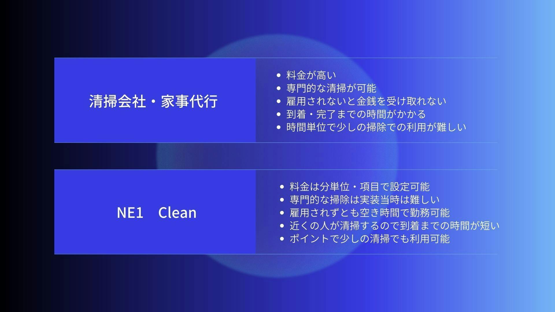 金銭的なメリットでは、従来までは清掃会社と契約するか、清掃員を雇うという形です。ですがNE1 Cleanを利用していただく事でポイントで掃除依頼をすることができるので時給で雇っている場合は30分で済む仕事でも一時間分を支払います。NE1 Cleanでは30分料金での清掃を依頼することが可能です。