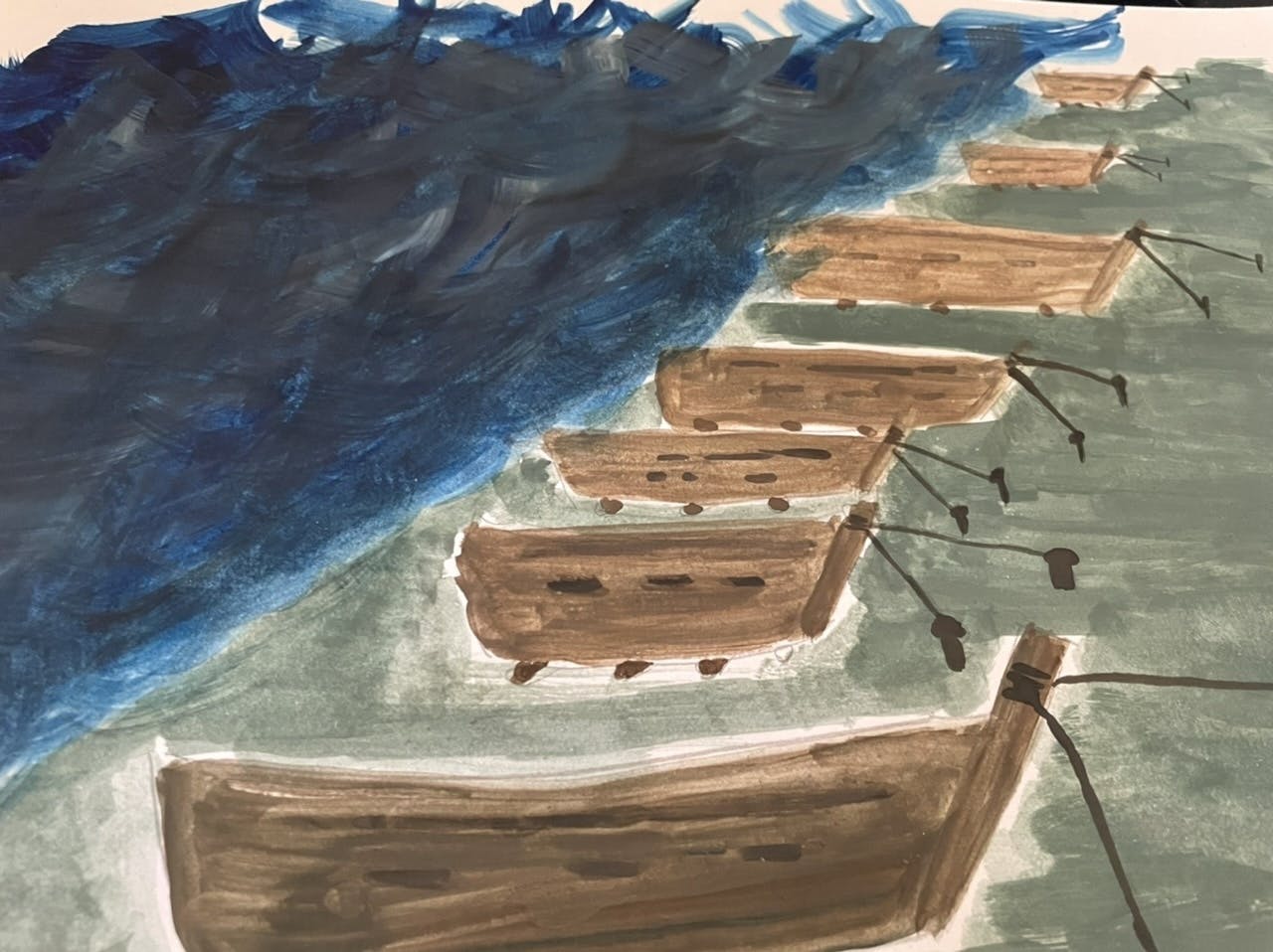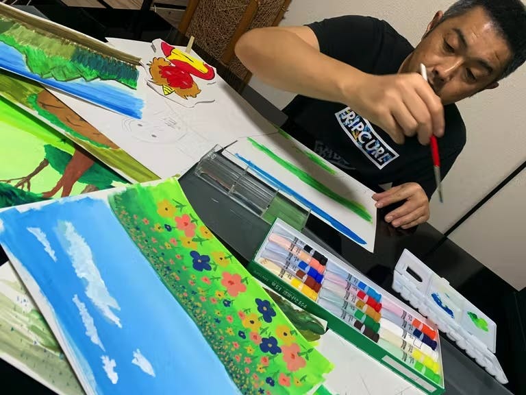 2022/08/30 17:15今晩は。ドリル饅頭の中西広和です。ううう〜・・・いよいよ、あと二日ですか。思いの外、一ヶ月が早かったですね。明日でプロジェクトが終わってしまうのがとても寂しいですね。ほぼ休まず走り続けて参りましたので、残り二日となったところで、若干、息が上がって来ましたが、まだまだ、やります!!!本日のトップ画像は『荒れ狂う夜の海に釣り船を係留する』という一枚です。おっちょこちょいの長兵衛さんで使う背景画となりますが『荒れ狂う夜の海』に、見えますかね??試行錯誤して、描いてみたのですが、なかなか難易度が高かったです…。ただ、自分でそういうお話を書いてしまったので、仕方ありません。何となく水彩画のYouTubeなどを見てヒントを貰ったりしているのですが、実際に描くとなるとなかなかイメージ通りには参りませんね〜。それでも、だいぶ良い感じになったので、一旦、これで良しとします。本日はもう一枚!!!ラストスパートですからね、手を止めません!!こちらは、長兵衛さんのお家です。若干、家が傾いてますね。随分、危ないお家に住んでますね。自分で建てたんでしょうか。おっちょこちょいですね!笑そういう想像してみるのも楽しそうですね。自分自身でも狙ってる部分と偶発の部分が混在しているので、「これぞ手作り!」といった風合いが随所に出ているような気が致します。結局、【おっちょこちょいの長兵衛さん】と【ぽったり、ぽったり】の朗読動画は、撮影は終わっているものの、編集に時間が掛かってしまい、あえなくタイムアップとなりそうですが、【三粒の大豆】の朗読動画を完成させた時点でこのプロジェクトが目指す方向とやりたい事の雰囲気は伝わったと思いますので、残りの二作は、本来のあるべき形で撮影し、完成版をお届け出来ればなと思っております。あと二日、何とか体調も良く、最後まで完走出来そうです!!!中盤の不安要素が私自身の健康面だったりしたので、速度調節が全く出来ない私は常にアクセル踏みっぱなしで走ってしまうので、このままフルスロットルでも最後まで持ってくれそうなので、本当によかったです。さー、悔いの無いよう最後まで走り続けよう!!!!最後までお付き合いのほど、宜しくお願い申し上げます!! もっと見る