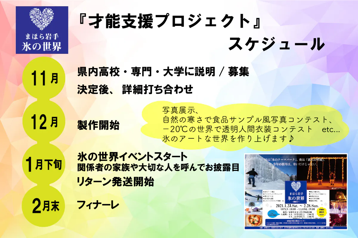 2021/12/29 09:08=才能支援プロジェクト第一弾のご報告=氷の世界2022才能支援プロジェクト第一弾として、盛岡商業高校さんと、盛岡北高校の写真部さんをまほら岩手の写真講習会とイルミネーションにご招待しました!コロナ禍でなかなか才能を発揮する機会が無い学生さんと一緒に、まほら岩手の一大イベント「氷の世界」の舞台で一緒にコンテンツを作れないかな?と考えたのが始まりです。講師は、奏photographの藤島昌弘先生!現役プロカメラマンです。どうしてカメラマンになったのか。プロの世界とはどんなものなのか。機材の使い方やすぐに使えるテクニックなどなど。おもしろエピソードも交えながら、普段の講習会では聞けないようなお話もたくさんしていただきました。外での自由行動では、藤島先生から学んだテクニックを早速活かしてお友達同士、雪に転がりながら、イルミネーションをバックに、パシャパシャ!今回撮影した写真は、氷の世界の期間内(1/22-2/27) ツリーハウス 内にフォトギャラリーとして飾られます!また、この講習会開催の資金はクラウドファンディングで支援いただいた方々がいらっしゃって開催できました。本当にありがとうございます。第二弾 盛岡情報ビジネス&デザイン専門学校第三弾 盛岡誠桜高校 食物調理課もございます。引き続きご支援のほど、よろしくお願いいたします。 もっと見る11/30活動報告(プロジェクト参加者が決まりました!)