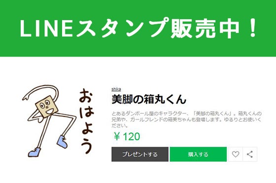 こんにちは、A-SU Lab.(アスラボ)です。 私たちのプロジェクトにたくさんのご支援をいただきまして、 本当に本当にありがとうございます。 メンバー一同、寒さに負けず頑張ります! さてこのたび、アスラボのデザイナーであるshikaさんが LINEスタンプの販売を開始いたしました! その名も「美脚の箱丸くん」です! どこかのダンボール会社のキャラクター「箱丸くん」が その美脚っぷりを存分にアピールするという とってもユニークなスタンプです。 ※シュールではなく“ユニーク”です! スタンプは「LINE STORE」(https://store.line.me/stickershop/product/1833603/ja) もしくはLINEアプリ内のスタンプショップにてご購入いただけます。 クスッと笑ってしまうこと間違いなし(?)な仕上がりですので よろしくお願いいたします! 2017年12月28日 A-SU Lab. https://www.facebook.com/asulab.media/ https://twitter.com/asu_lab