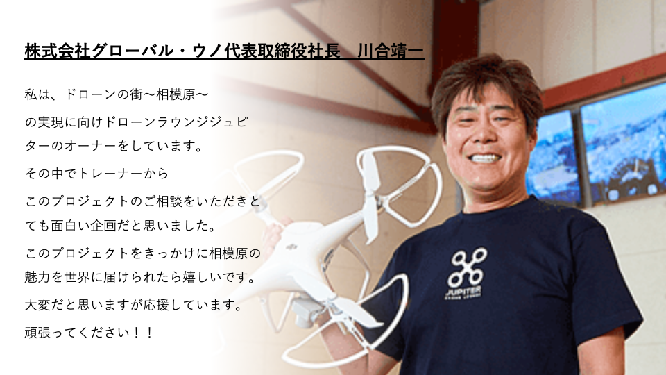 ドローンラウンジジュピターで日頃から「ドローンの町、相模原」を目指していること、話題性の出るプロジェクトを目指したいことから、本プロジェクトの映像は全てドローンで行うことにしました。