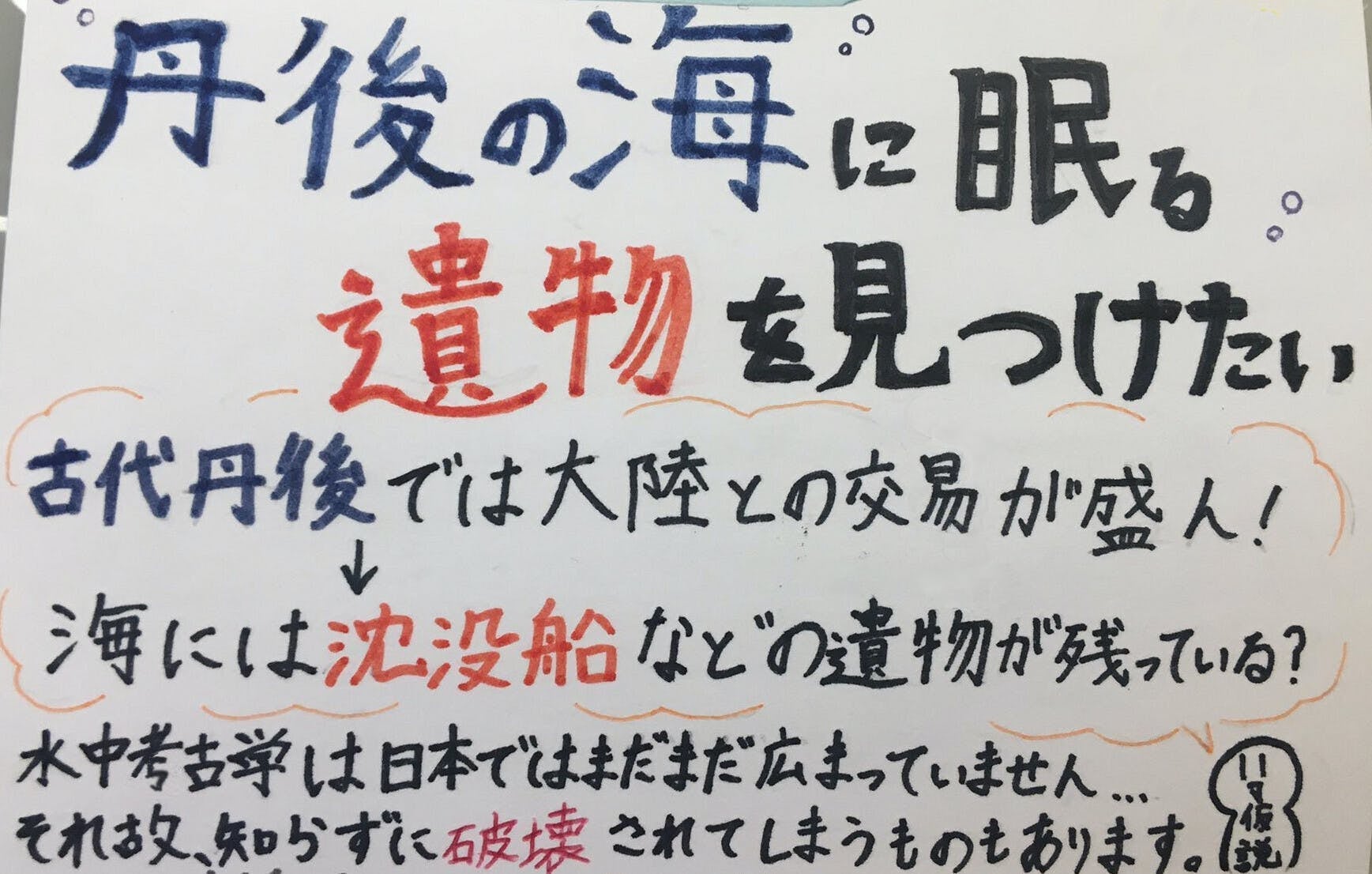 水中考古学について、自分なりにいろいろと調べて仮説を立てました。丹後は海とのつながりの強い、海を大切に思う人が多い地域です。私の地元の海にも水中遺跡はあるはず...。水中考古学について調べたことを、学校の自由研究などで発表をしました。