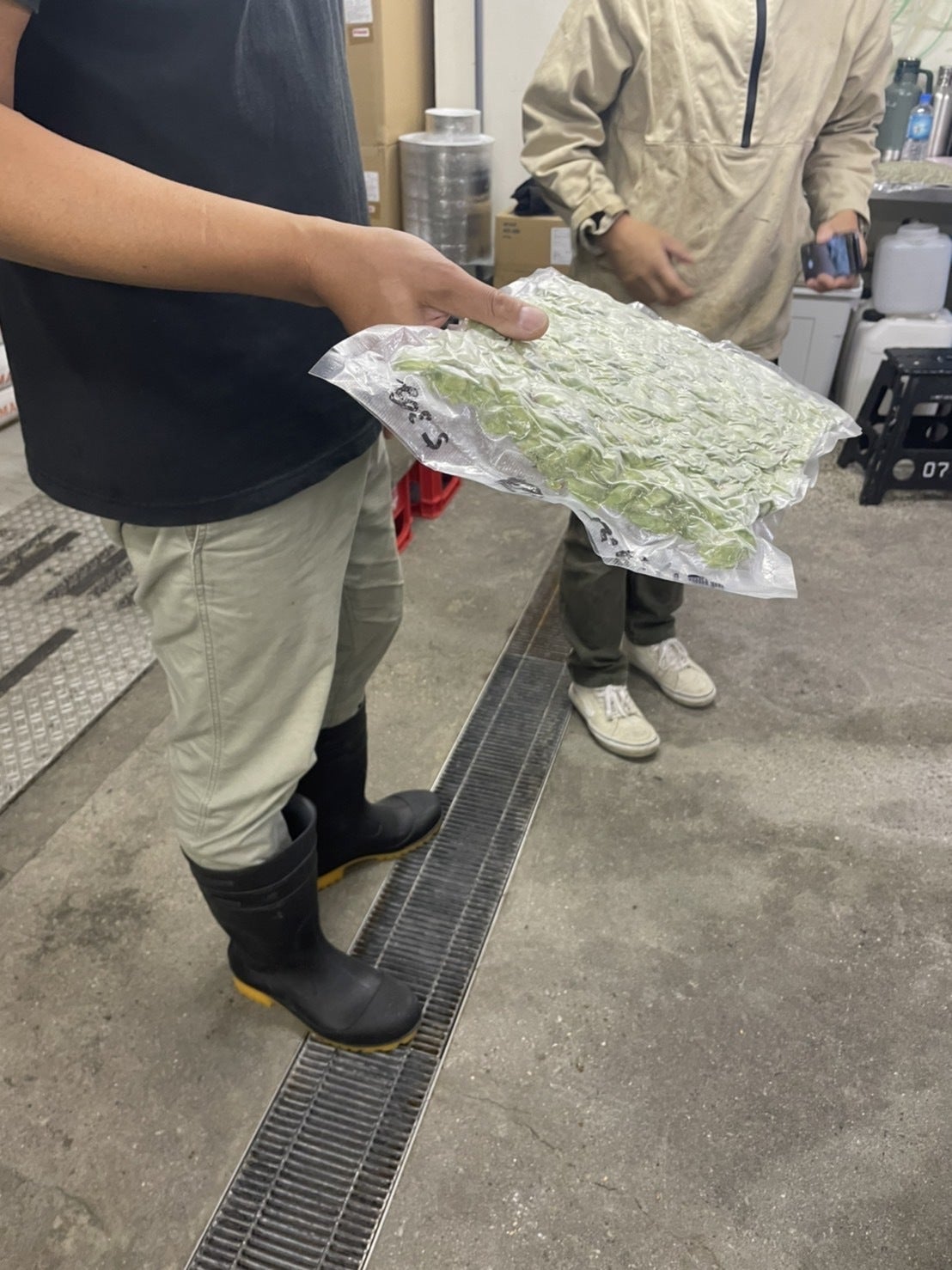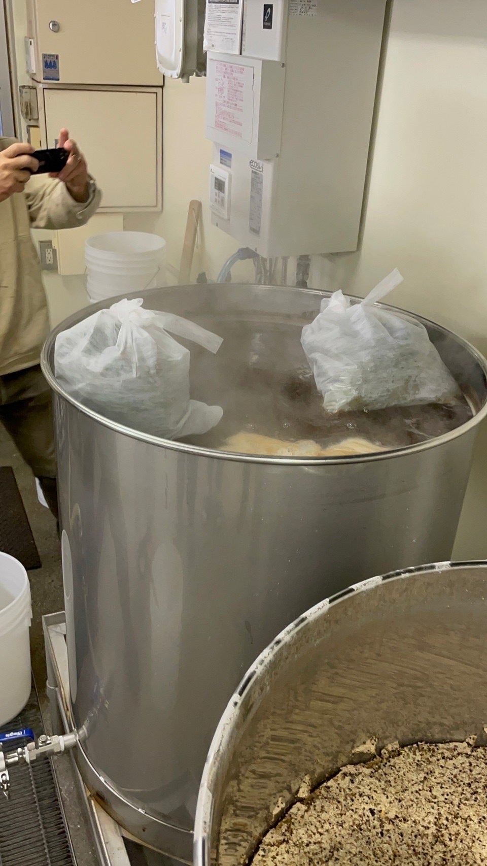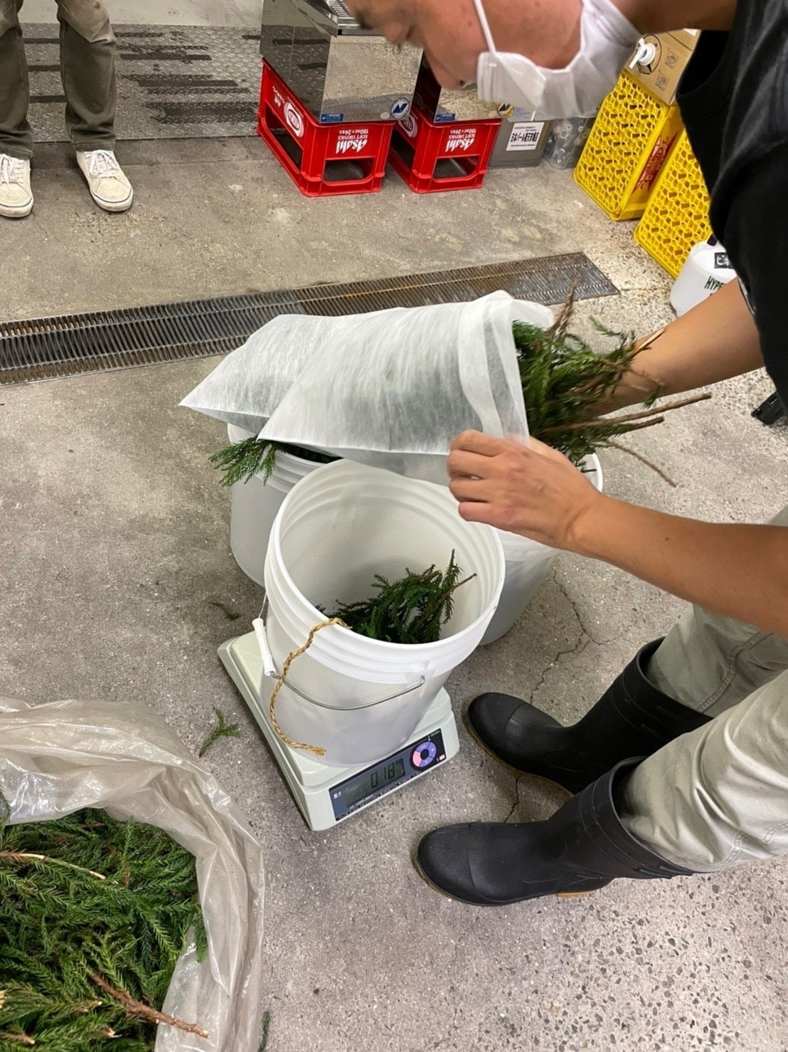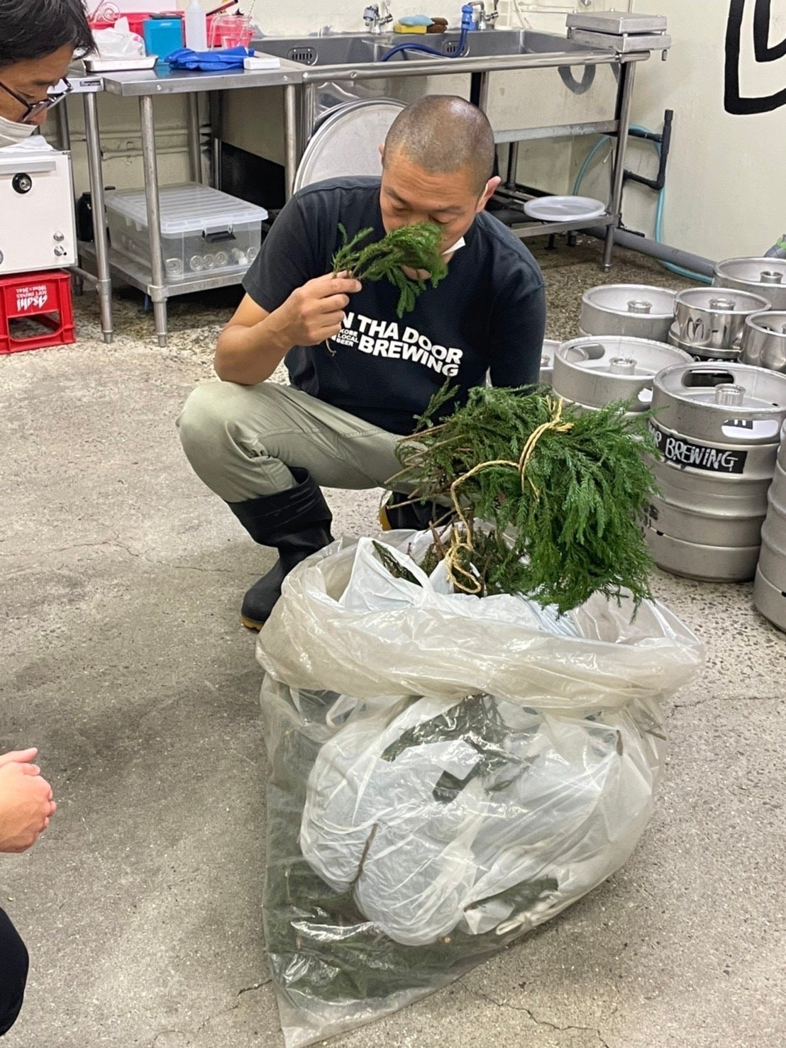 時間が経ち、糖度を測り、ある程度上がったら、ビールに必要なホップを入れていきます!! 中戸さん曰く、杉の葉は柑橘系の香りに合う気がするらしく、その場で決められていました。 さすが職人さんです。