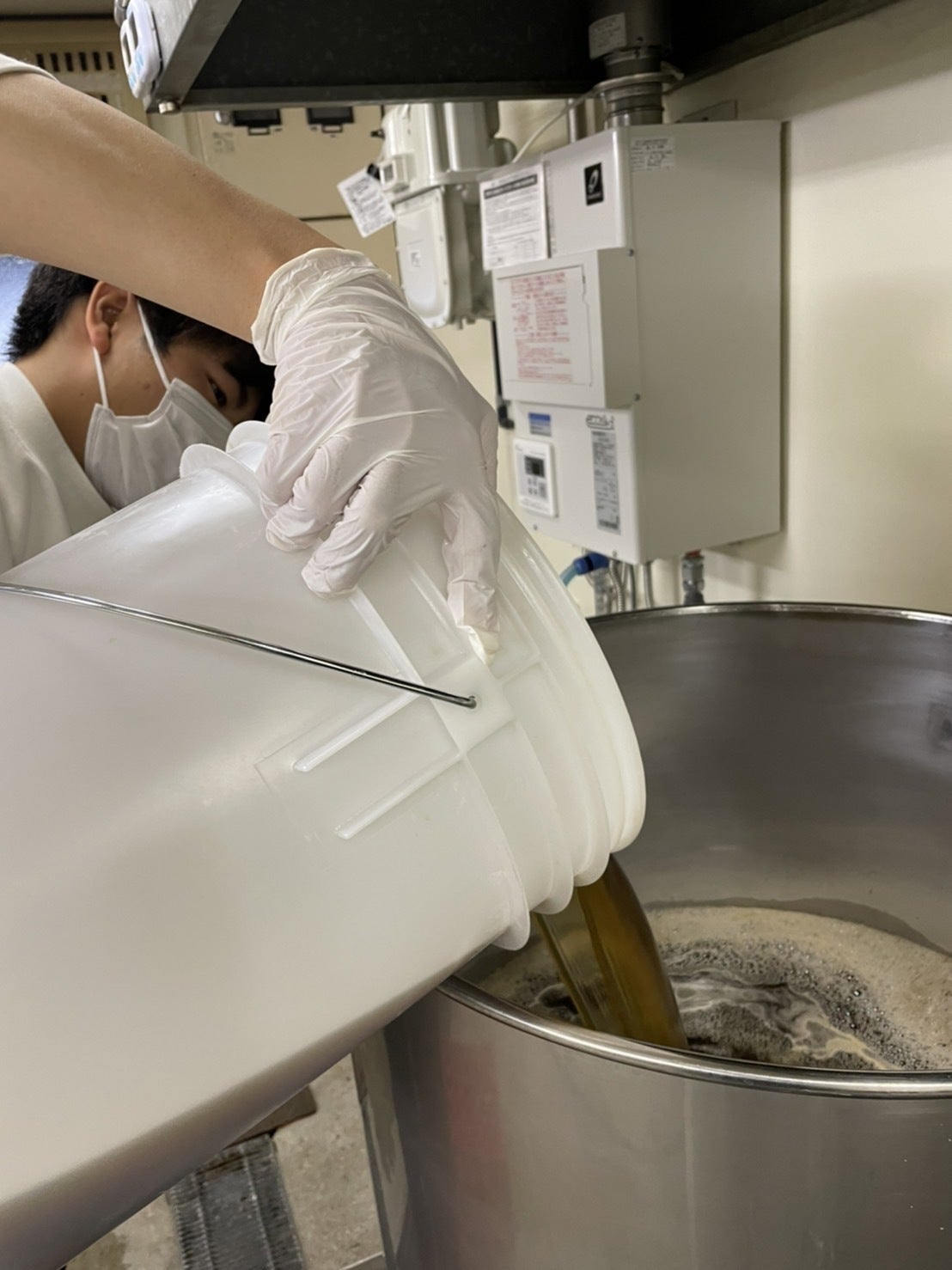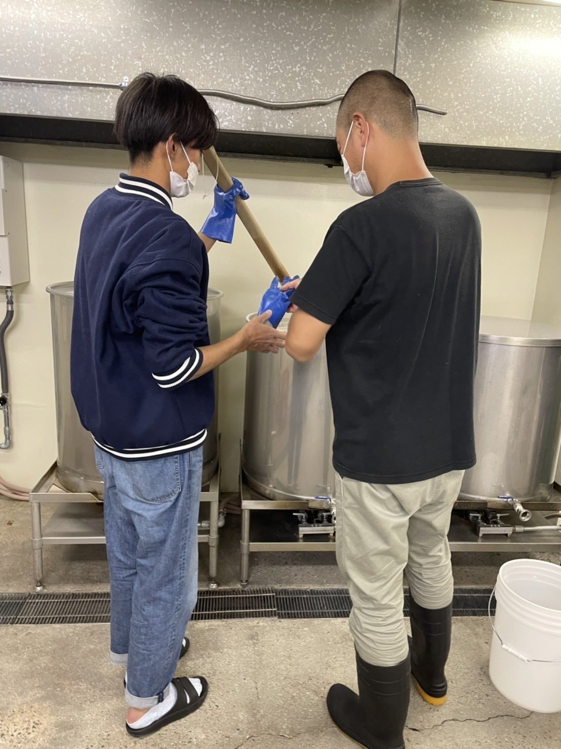 実際にお湯と混ぜる工程を私たちも手伝わせていただきました。棒で混ぜるのにも一苦労で、全員が「おもっ」と言っていました(;・∀・)
