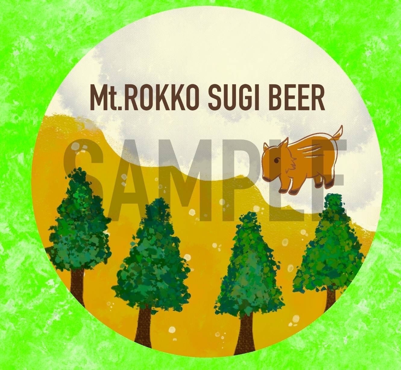 すぎの葉ビールをイメージし、背景にはビール、前面にはすぎの木を描きました。また、甲南大学生のイメージとして、甲南大学のマスコットキャラクター「なんぼーくん」になぞらえて、うり坊も描きました(^^)/