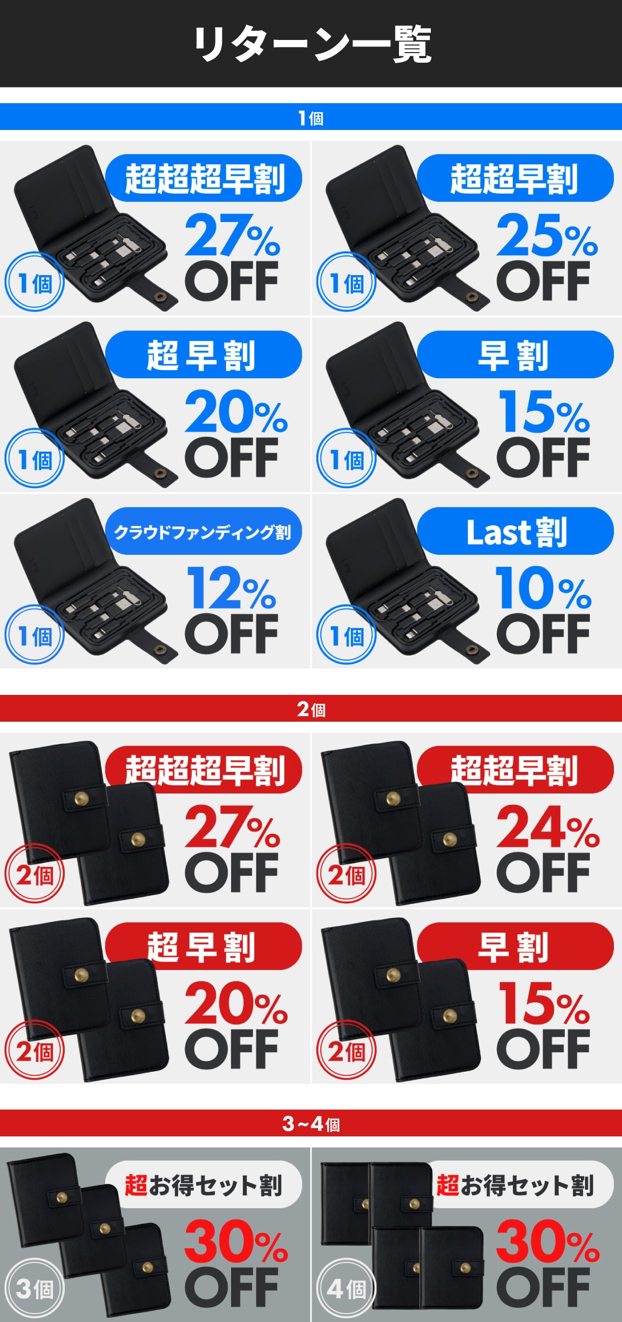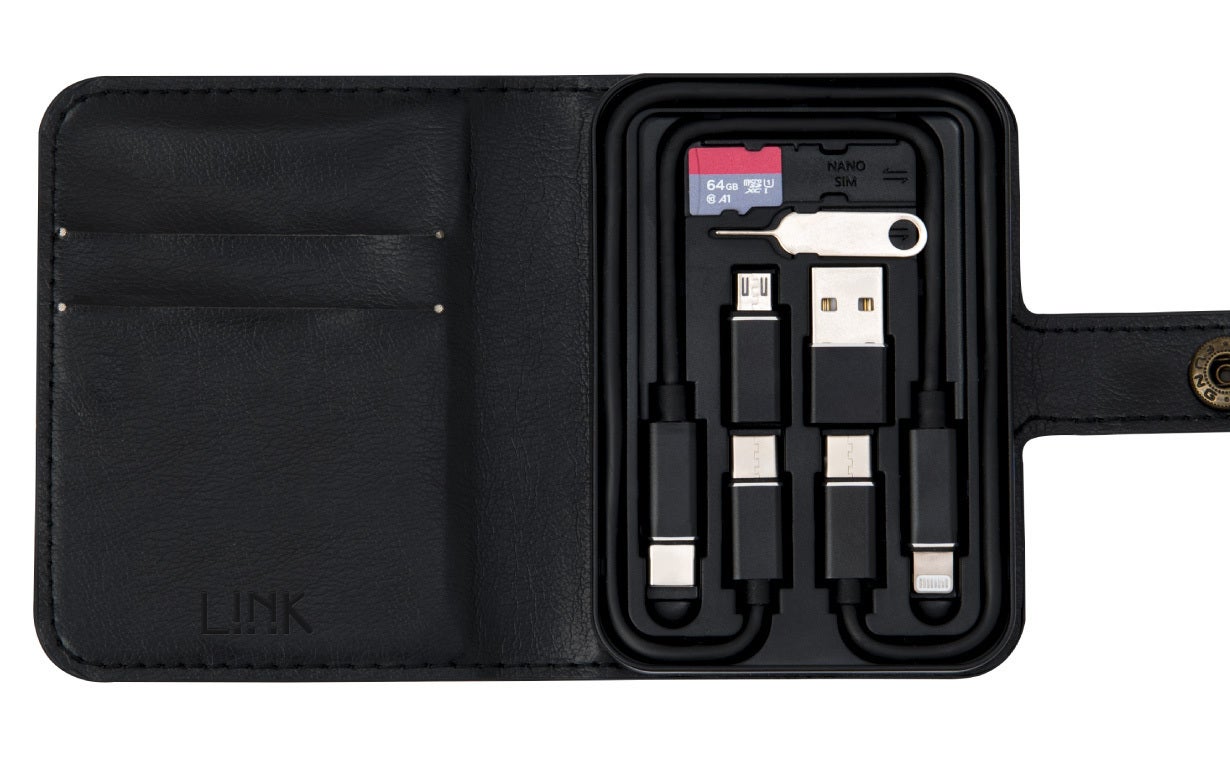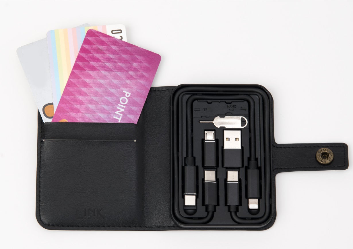 1 枚のカードケースに 6種類の充電ケーブルが入っている、