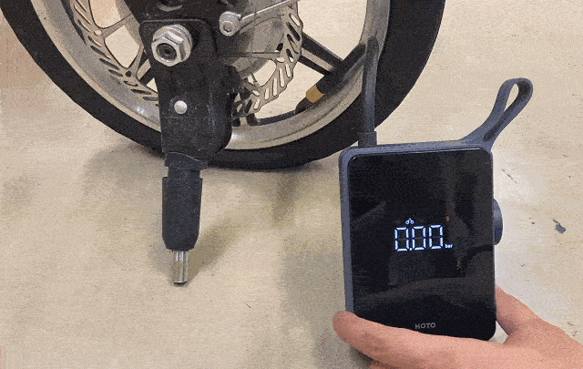 2. 本体が自動でタイヤの空気圧を測定し、LCDディスプレイに現在の内圧が表示される。