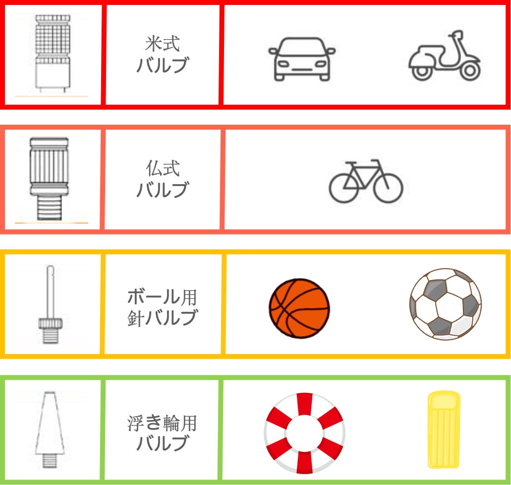 「HOTO AIR-KID」には、備え付けの米式バルブ以外に仏式バルブ、ボール用針バルブ、浮き輪用バルブの計3種類のバルブが付属しており、幅広い対象に対応可能です。