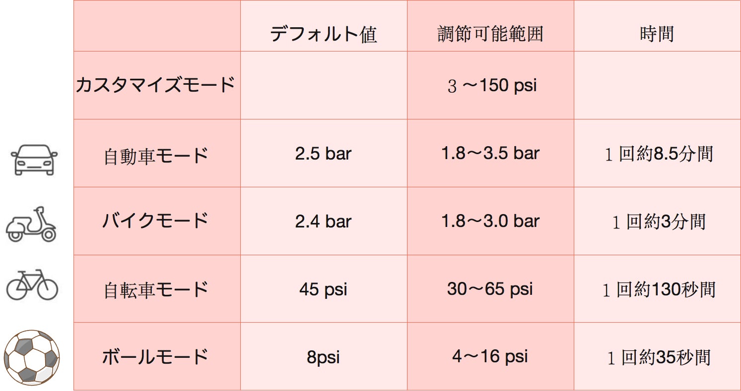 肝心の空気充填モードは、自動車、バイク、自転車、ボールの4種あり、