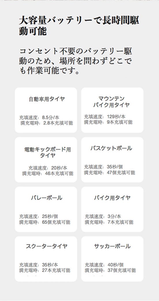 ※満充電×25℃環境時。また、各タイヤはサイズ、インチにより本数が増減しますことご理解ください。