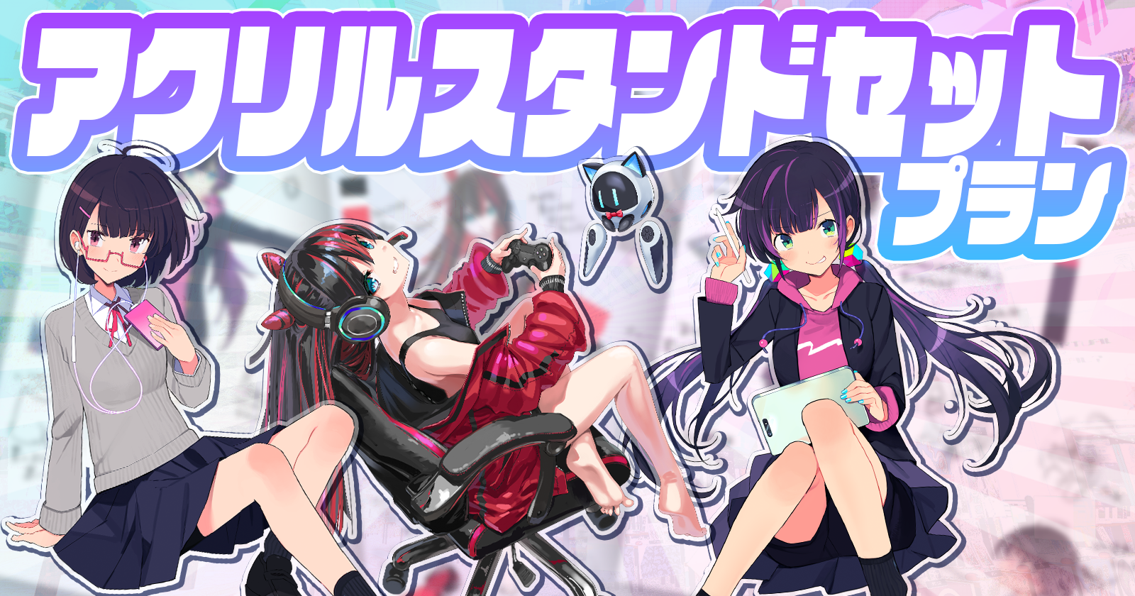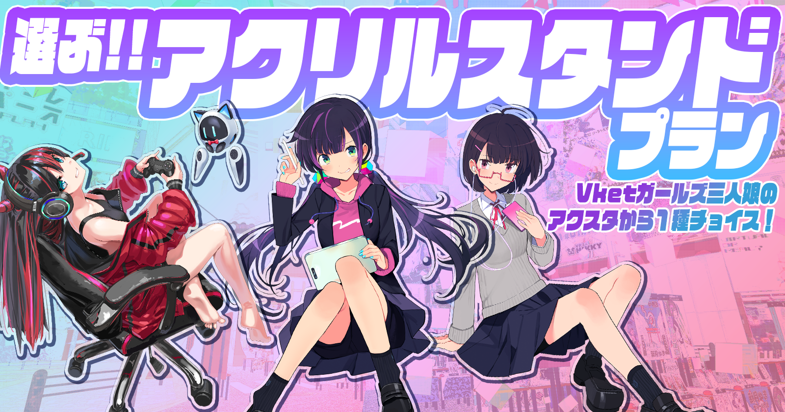 推しグッズと言えばアクリルスタンド!透明感あるアクリルに高精細印刷されたVketガールズたちの姿を、常にお手元に置いておくことができます。
