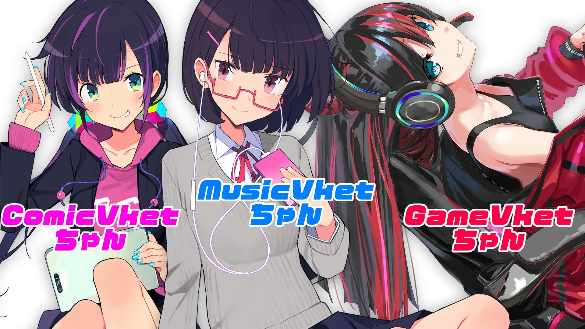 目指しているのは、VirtualMarket の中でもサブカルチャー方面に位置する派生イベントである同人誌イベントの「ComicVket」、同人音楽イベントである「MusicVket」、インディーズゲームイベントの「GameVket」の3つを担当する「ComicVketちゃん」「MusicVketちゃん」「GameVketちゃん」の3名の3Dアバター化です。