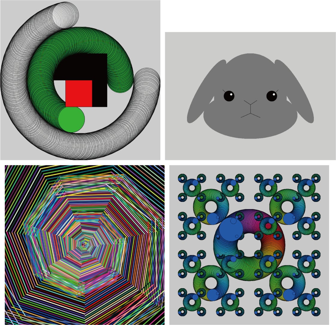 プログラミングの基本を楽しく学ぶことができています。簡単なプログラミング言語を組み合わせて複雑な幾何学模様ができたときは非常に達成感を感じました。今後はさらに複雑なコードを使いこなし、周りがあっと驚くようなアート作品に挑戦していきたいと思います。(人間発達文化学類3年 Aさん)