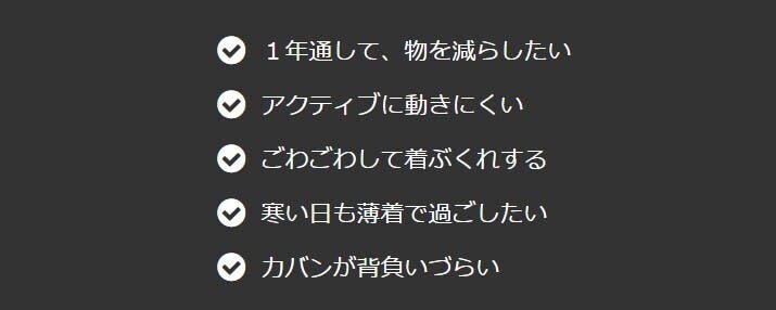 体調不良で元気がない時、体力的にしんどい時にも、コートなどに比べて軽いので身体のかかる負担が少ないため、寒い時の活動がしやすくなります。従来の重たい冬服を着ておられる方には非常におすすめです。