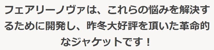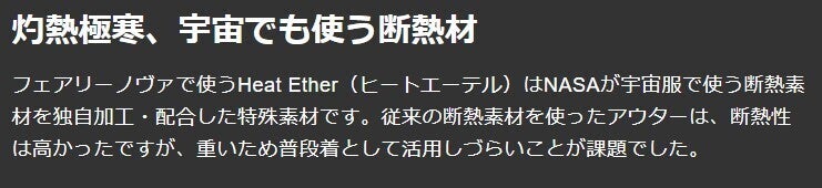「フェアリーノヴァ」は、NASAが宇宙服で使う断熱素材を独自加工した素材を配合し、薄い生地でありながら、防寒性、デザイン性、耐久性のすべてを高い次元で満たす高機能ジャケットです。