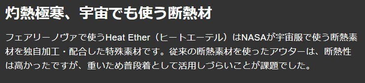 フェアリーノヴァに使われるヒートエーテルに熱を生み出す機能はなく、空間を作り出すことにより、外の寒さと中の体温との温度差を断熱、遮断をすることが出来ます。これにより人の体温を一定に保つことが出来るため、外気温に影響されず、対応気温が幅広く氷点下だけでなく、15度前後まで対応可能で、春や秋も使えるため、冬用ジャケットを用意する必要もありません。