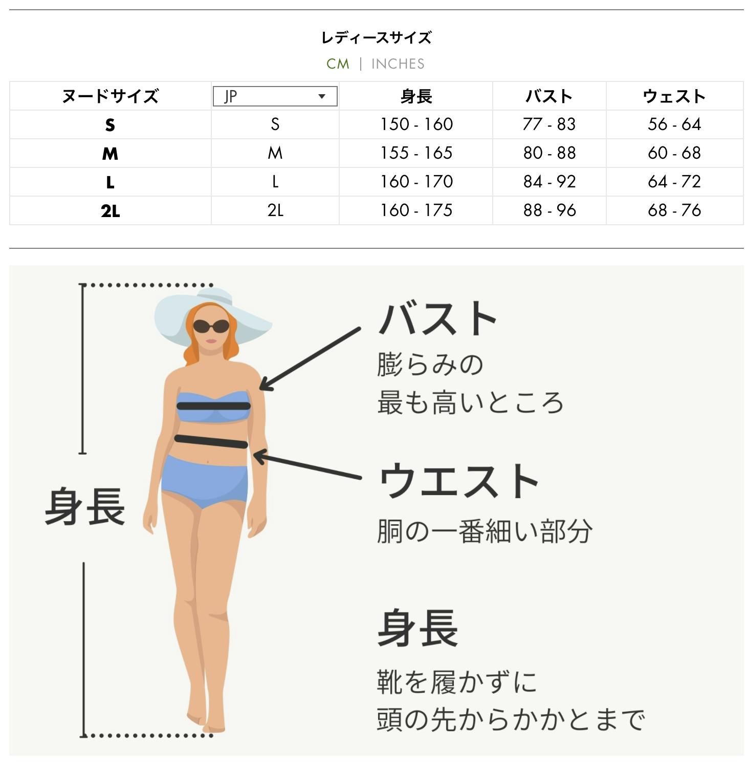 サイズの確認は、まずヌードサイズ表から自分の身長、チェスト、ウェストを確認してください。もし、身長、チェスト、ウエストこの3つ数値が同じサイズの範囲内の場合は、該当サイズを選んでください。もし、身長、チェスト、ウエストこの3つ数値が同じサイズの範囲内ではない場合、ぴったりかゆったり自分のお好みに合うようにご検討下さい。製品の採寸表もございますので、そちらもご確認の上、ご参考にして頂ければ幸いです。