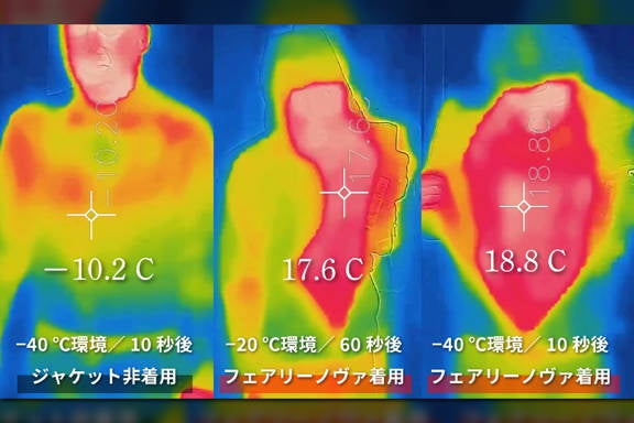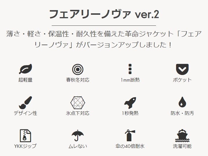 従来のフェアリーノヴァは発熱機能がなく、着用者の体温と外気温を断熱することにより、暖かさを生み出す製品でした。しかし、発熱量が少ない方、体温が低い方には寒く感じるというご意見もあり、ver.2ではこの部分を改善すべく、誰でも必ず暖かく感じる発熱機能を追加しました。