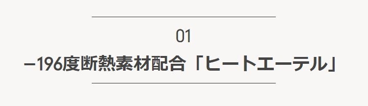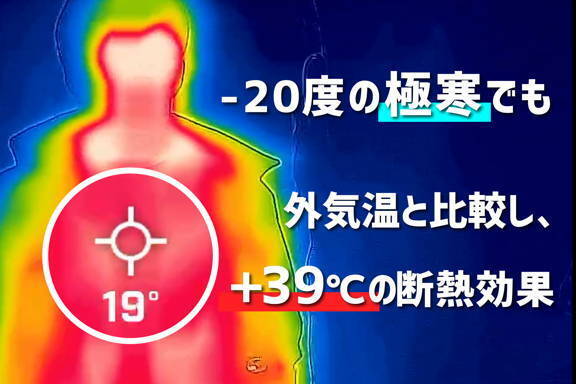 軽さと防寒性を両立したHeat Ether®(ヒートエーテル)がどのくらい凄いのか、実際に実験した結果がこちらです。これだけ寒い状況下でも、さすがは宇宙空間に対応する素材。周りの空気を断熱し、暖かさをキープしています(※--20度では1分後、-40度ではテスト施設の関係上10秒後の測定結果を表示しています)。