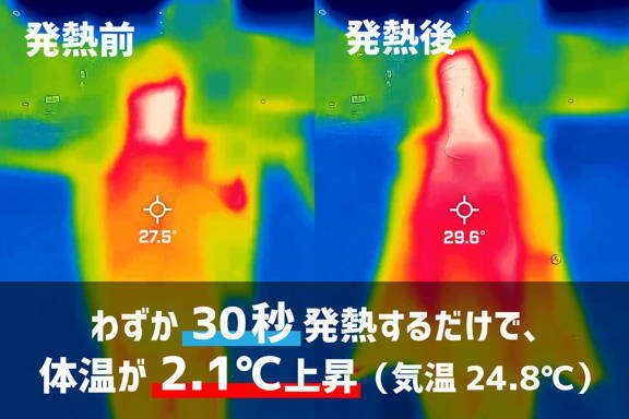 この発熱がどのくらい効果があるのか、実際に実験もしてきました。ボタンを押す前と押した後を比較した結果、なんとわずか30秒で、2度も着用者の体温が上がっていました。(※発熱モードは最大の53度で、24.8度の環境で測定しています)