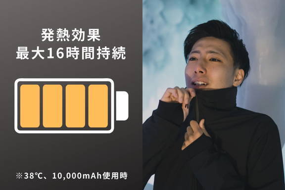 基本的に発熱しなくてもヒートエーテルで断熱し保温するジャケットのため、あえて発熱シートは2枚にしています。これによって、3枚配置するよりも使用出来る持続時間が伸びる上、ケーブルやシート分も軽量化出来ました。USBケーブル対応のモバイルバッテリーに対応し、測定した結果10,000mAh容量であれば、38度で最大で約16時間使用可能です。※使用環境や状況により異なる場合がございます。