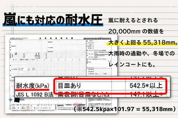 耐水圧については、第三者機関にて検査を行っており、検査の結果、50,000mmの耐水圧を有していることを確認できました。この数値が低いと圧力がかかると水が浸透してきますが、20,0000mm以上で嵐にも耐えうる数値のため、レインコートのようにご利用頂くことが出来ます。