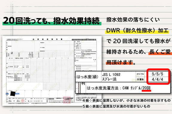 表面生地には撥水力が落ちないように、約20回洗濯しても、撥水効果の落ちにくいDWR(耐久性撥水)加工をしています。これにより、すぐに撥水効果がなくなることがありません。