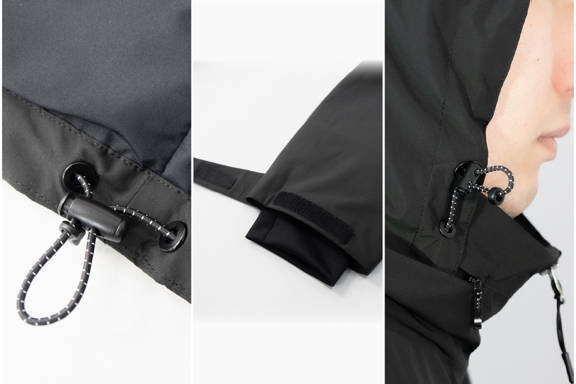 表面は風を通さない防風機能を備えているので、バイクや自転車等で風に強く当たる方にもオススメです。腰には調整ゴムがついており、更にver.2からベルクロに加え、手首にインナーリブを追加し、首元も高さ・隙間調整を行い、防風対策を強化しています。