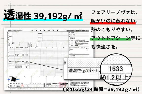 透湿性20,000g/㎡/24h以上(実際検査値39,192g/㎡/24h)