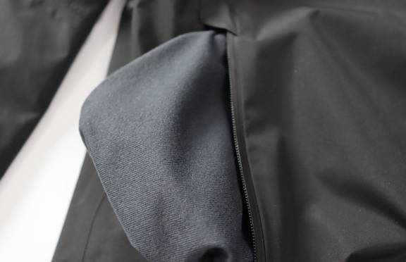 手を入れる左右のポケットは止水ファスナーになっていて、ポケット内側も暖かくするために起毛生地を変えてます。