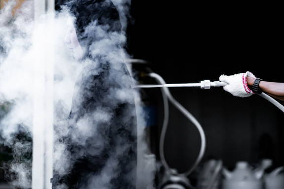フェアリーノヴァ2で使うHeat Ether®(ヒートエーテル)は、NASAが宇宙空間で使用する断熱材を独自加工し、配合した特殊生地です。-196℃の液体窒素を噴射しても冷気を遮断します(フェアリーノヴァを着用し、約60秒間、1m離れた距離から -196度の液体窒素を噴射しています)