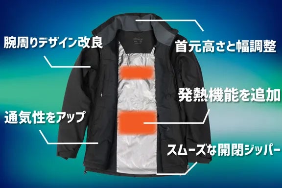 さらに従来のver.1に比べて、ver.2は様々な防寒性の改善を加え、更に断熱素材「ヒートエーテル」と発熱効果で、体感温度を大きく向上させることが出来ます。