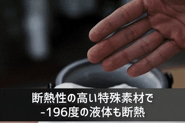この断熱配合素材「Heat Ether®(ヒートエーテル)」の注目すべきポイントは、ー196度の液体窒素に物体を入れても、外部の温度を遮断し、凍結しないところにあります!※検証のため指を入れて実験しています。危険ですので絶対に真似しないでください。