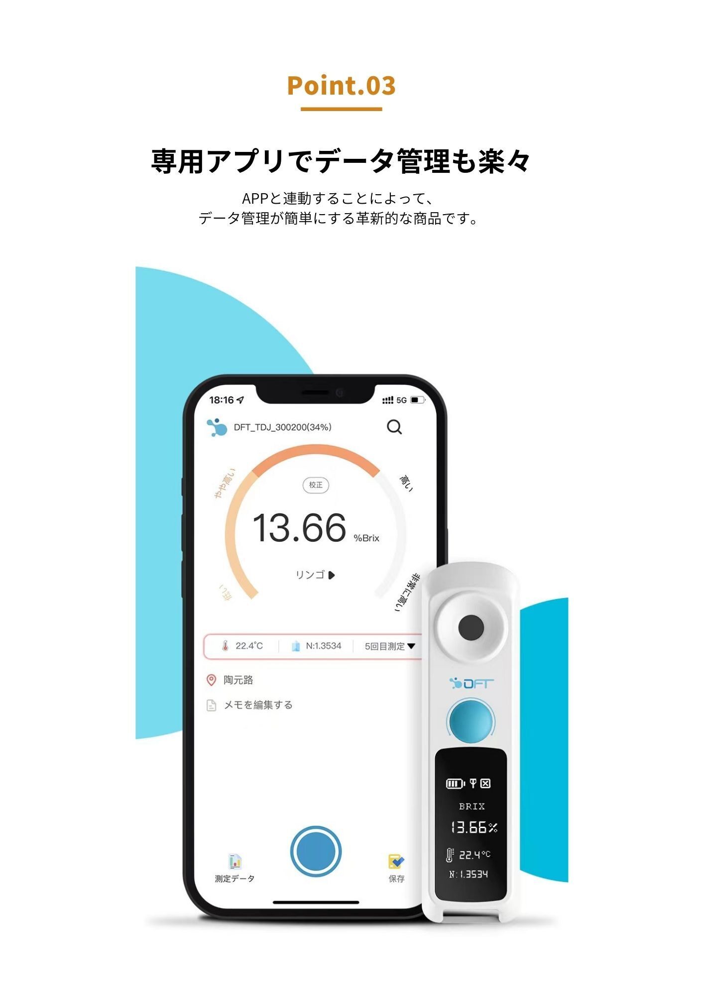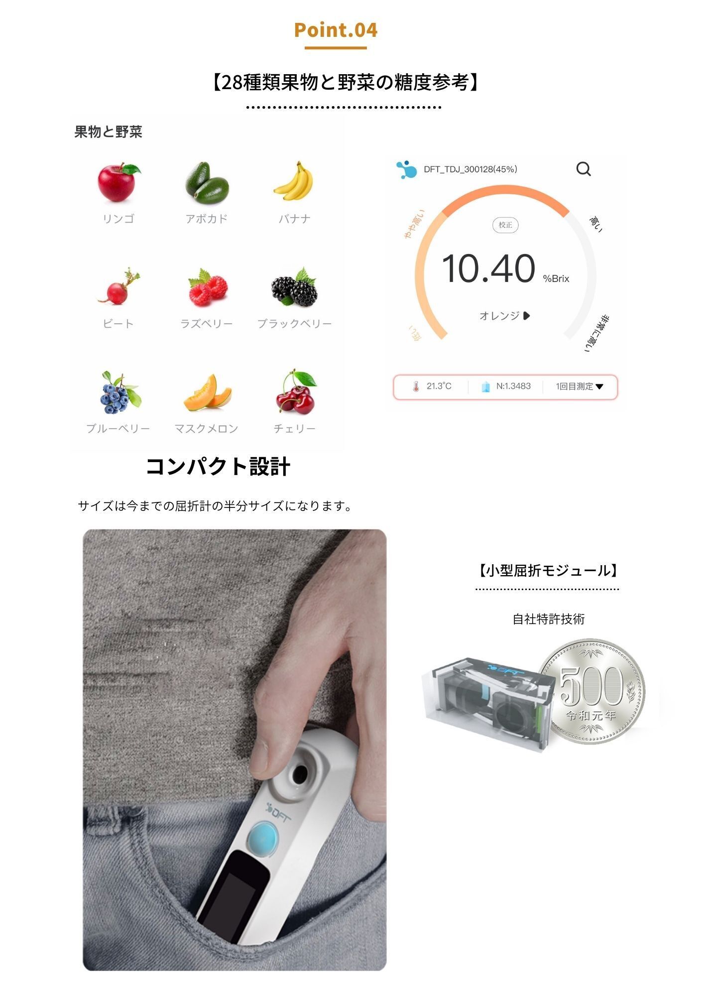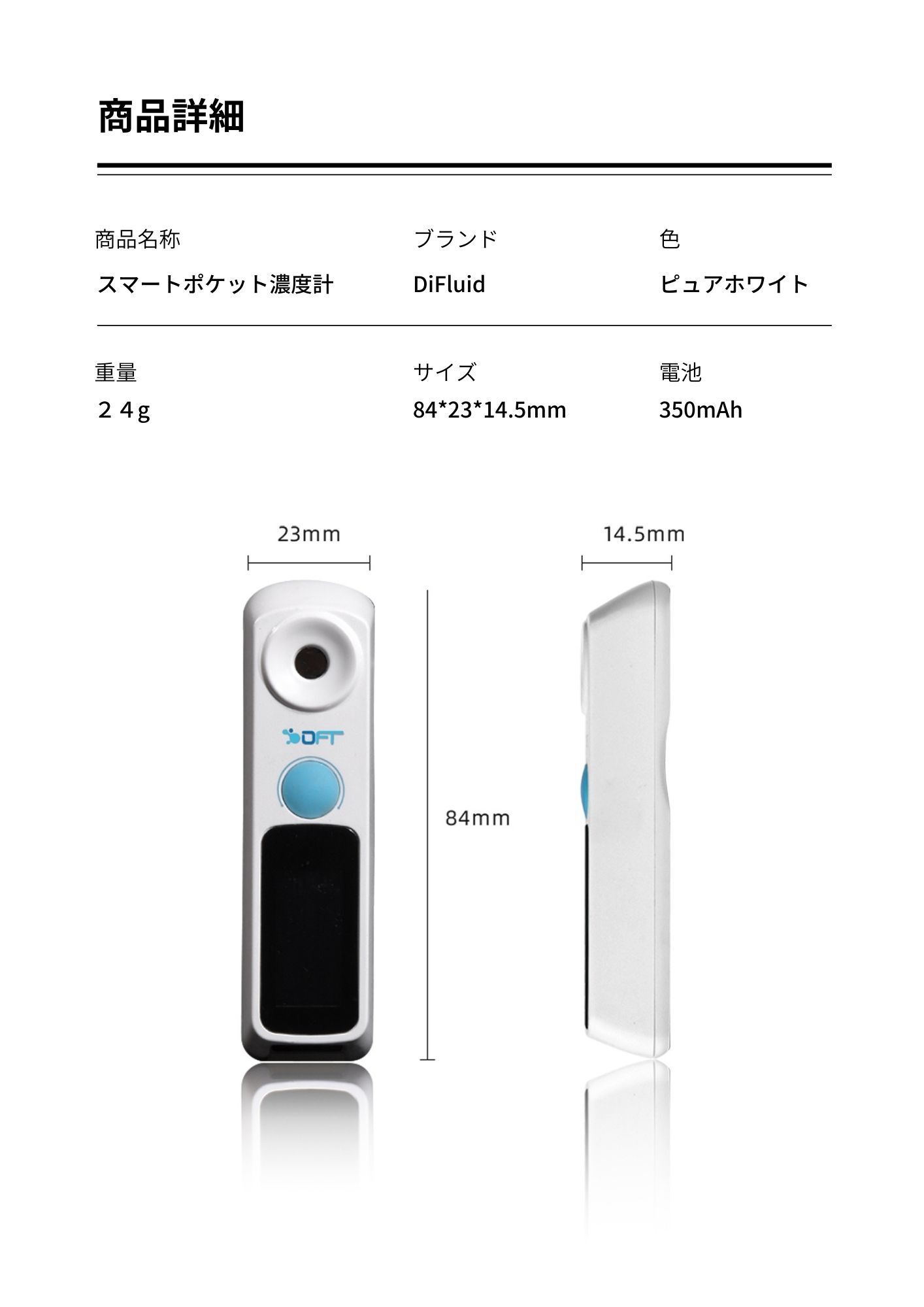 DiFluid 糖度計は果物、野菜、飲み物の「糖度」を測定可能なデジタル屈折式計 。これまでの糖度計はサイズが大きく高価だったため、個人向けの手軽な製品は見当たりませんでした。そこでDFT社は家庭内でも十分に使用ニーズがあるのでは?という事で、誰もが手軽に取扱い可能な製品を開発。コンパクトながら防水・防塵・耐衝撃性を備えているので利用シーンを選びません。また機能面も充実。高速測定機能により液体を投入後、たった2秒間で測定が完了。 専用APPでデータを活用した健康管理も可能です。!新しいライフスタイルを提案する商品となっております。