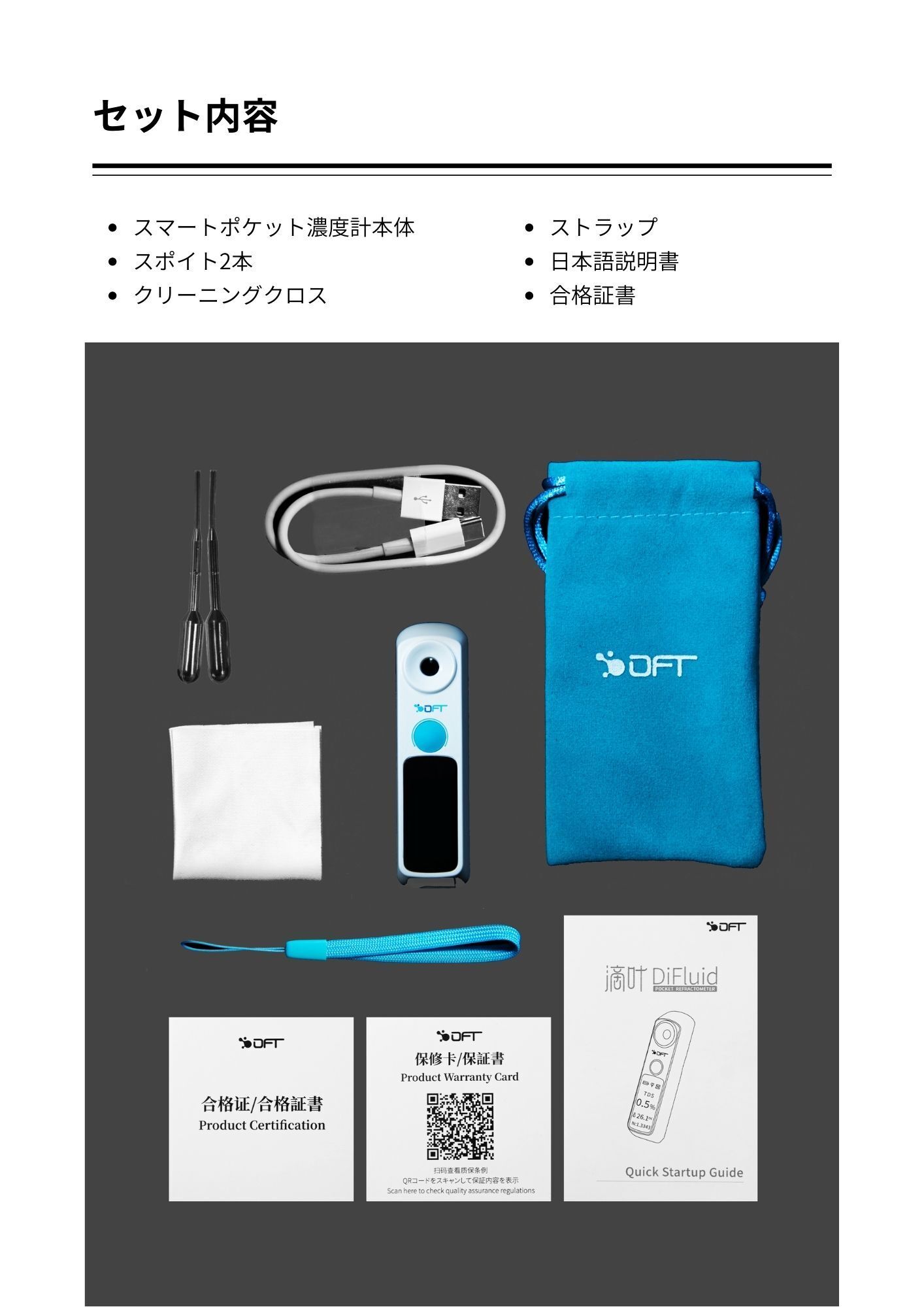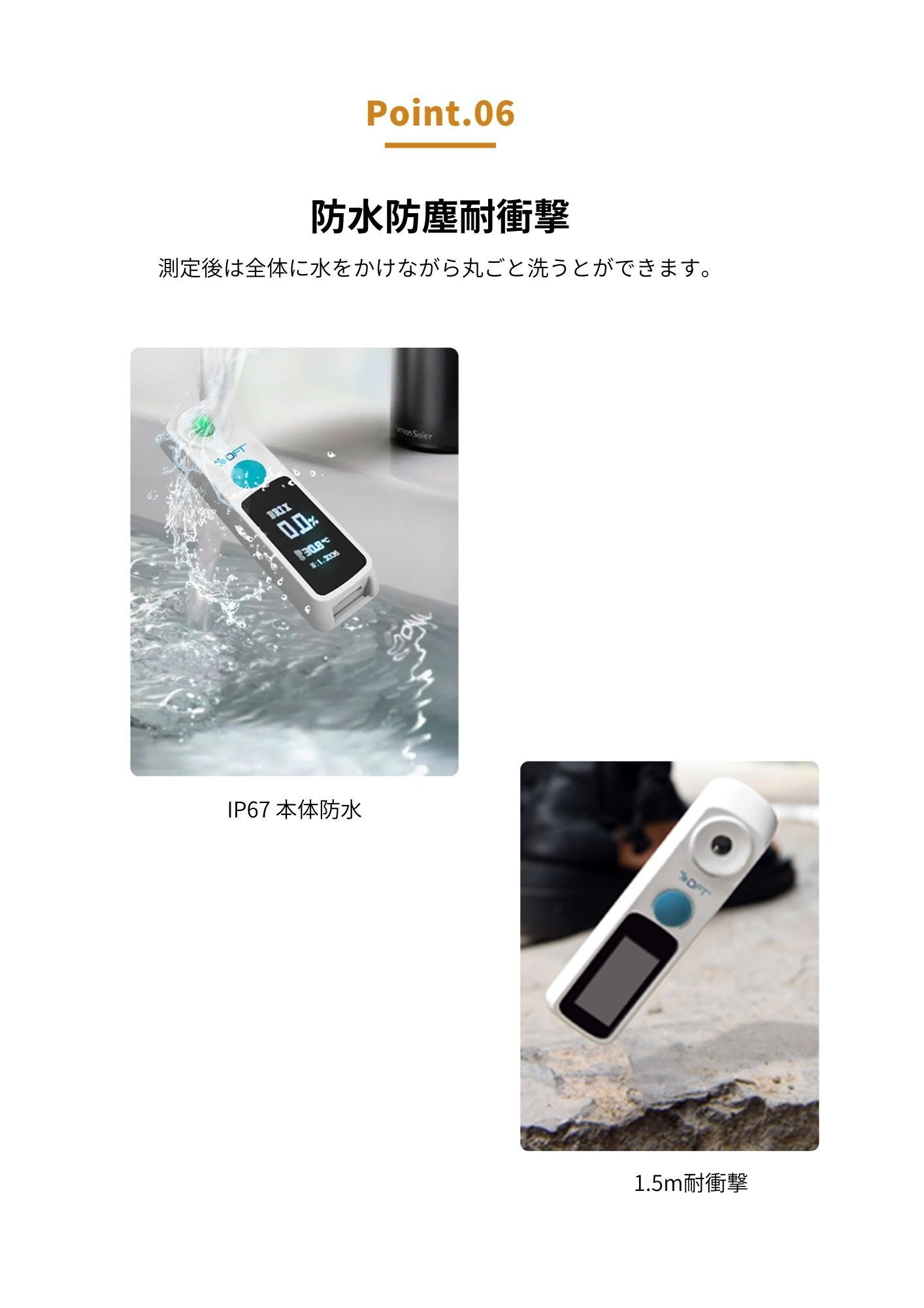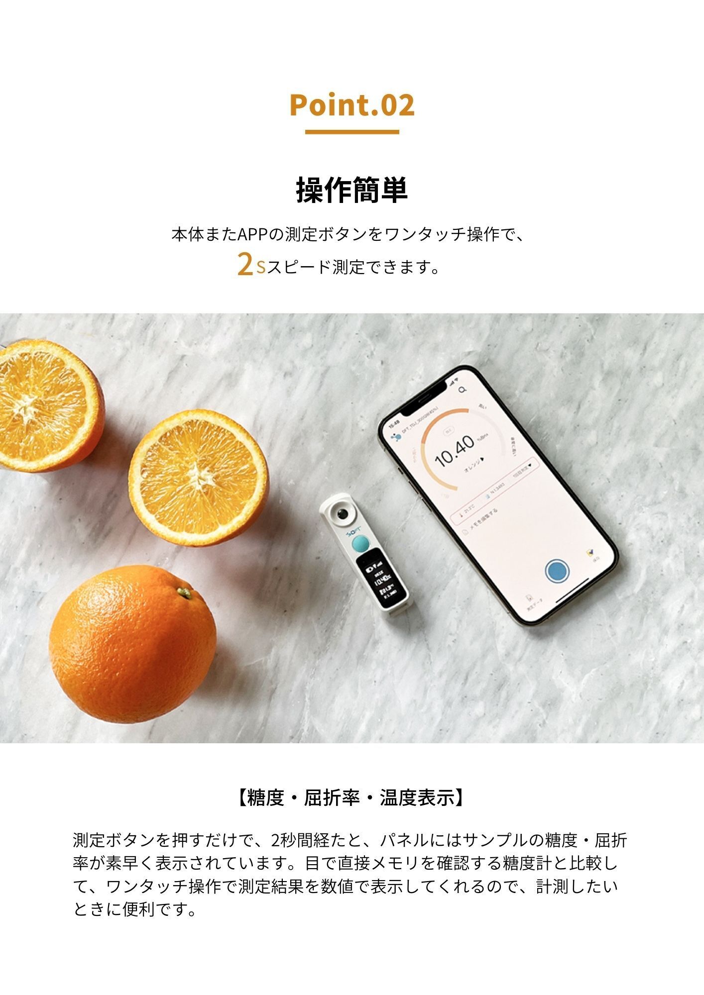 DiFluid 糖度計は果物、野菜、飲み物の「糖度」を測定可能なデジタル屈折式計 。これまでの糖度計はサイズが大きく高価だったため、個人向けの手軽な製品は見当たりませんでした。そこでDFT社は家庭内でも十分に使用ニーズがあるのでは?という事で、誰もが手軽に取扱い可能な製品を開発。コンパクトながら防水・防塵・耐衝撃性を備えているので利用シーンを選びません。また機能面も充実。高速測定機能により液体を投入後、たった2秒間で測定が完了。 専用APPでデータを活用した健康管理も可能です。!新しいライフスタイルを提案する商品となっております。