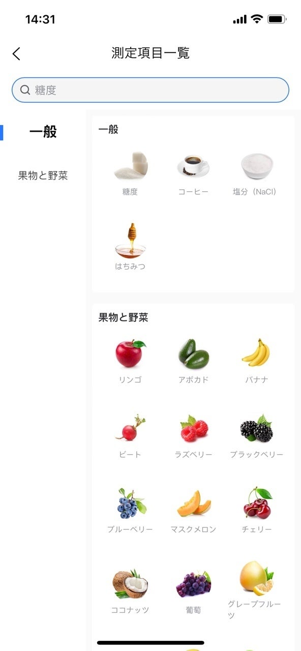 アプリ上にて測定したい項目を選択してください。本製品は「糖度」専用となるので「糖度」を選択後、画面に表示されている果物と野菜の中から対象となるものを選択してください。